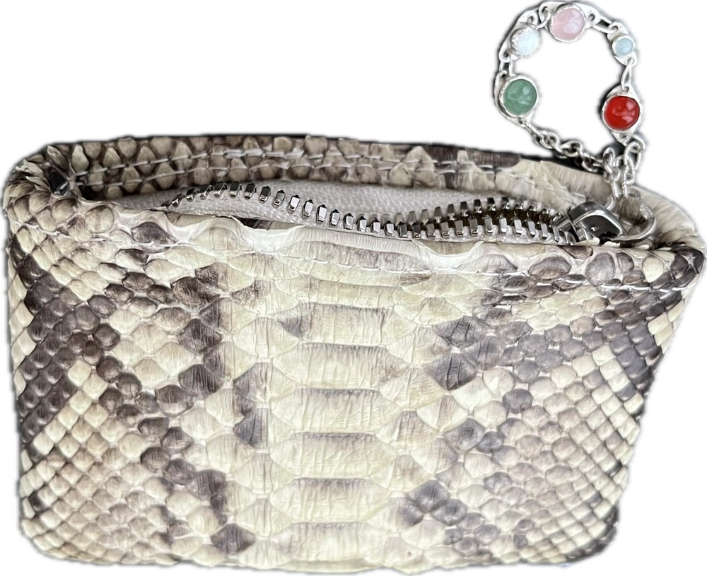 | materials | outshell : anaconda snake skin leather lining : sheep skin leather Aquamarin, aventurine, Opal, Carnelian gemstone, sterling silver(925) chain link, 'YKK' (made in JAPAN) zipper, Serafil polyester thread |